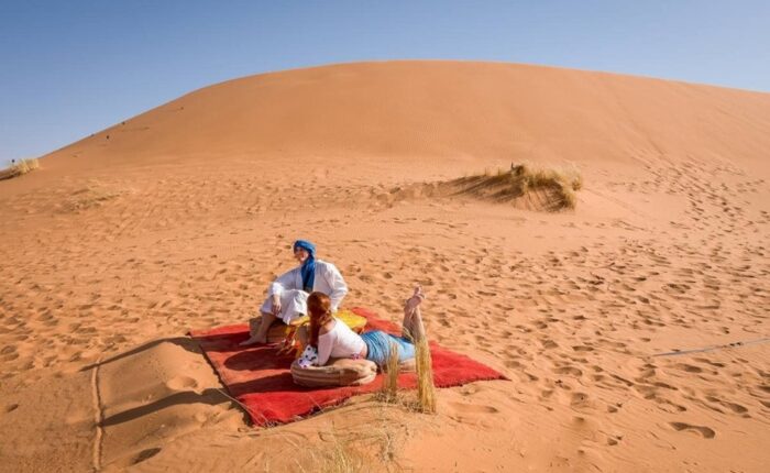 You will set off by camel for a 1/2-hour trek out onto the dunes to watch the sunset. You will spend the night in Berber tents (Dinner is included).