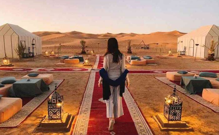 Marrakech to Merzouga distance is 560 Km. However, it will be split in two on the in with a night in Dades Valley. On the way back, you will spend the day driving to Marrakech.